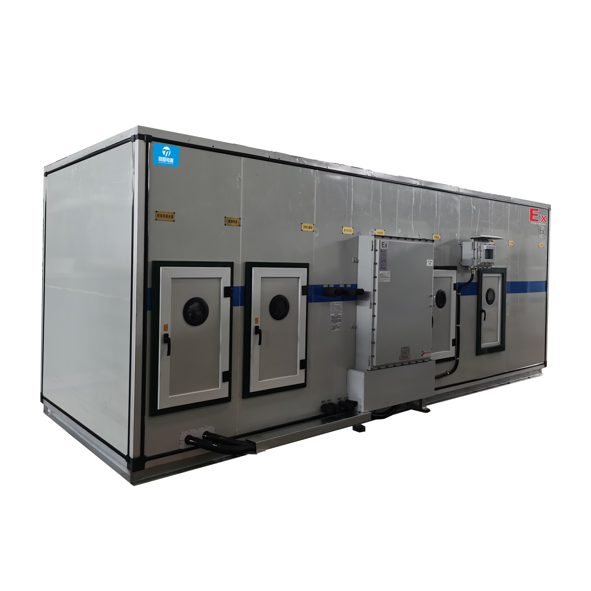 屋頂式防爆空調(diào)機組 全新風(fēng)防爆空調(diào)機 屋頂式空調(diào)系統(tǒng)為全空氣系統(tǒng),整個空調(diào)系統(tǒng)僅由室外主機和室內(nèi)送風(fēng)管兩部分組成,無需水泵、冷卻塔、風(fēng)機盤管等配套設(shè)備,亦無需冷凝排水管道,安裝使用極為方便。系統(tǒng)室內(nèi)無運動機械和水管,用戶無需為噪音和漏水煩惱,維修方便。機組置于屋頂或戶外空地,無需機房,節(jié)省初投資。機組不需二次冷媒,系統(tǒng)效率高。機組配上不同的功能段,可方便實現(xiàn)空氣凈化、除濕、加濕、降溫、供暖、新風(fēng)量調(diào)節(jié)等多種功能。