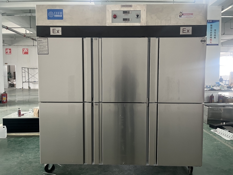 我公司生產的六門不銹鋼同騰防爆冰箱(以下簡稱防爆冰箱),產品防爆要求是根據GB3836.1-2010《爆炸性環境 第1部分:設備 通用要求》、GB3836.2-2010《爆炸性環境 第2部分:由隔爆外殼“d”保護的設備》、GB3836.4-2010《爆炸性環境 第4部分:由本質安全型“i”保護的設備》、GB3836.9-2006《爆炸性氣體環境用電氣設備 第9部分 澆封型“m”》及GB3836.15-2017《爆炸性氣體環境用電氣設備 第15部分:電氣裝置的設計、選型和安裝》的規定制成防爆結構,經國家授權的質量監督檢驗部門檢驗合格,其防爆標志為ExdbibmbⅡCT4 Gb。適用于工廠存在或可能存在ⅡA、ⅡB級、ⅡC,T1~T4組可燃性氣體、蒸氣與空氣混合形成的爆炸危險1區或2區場所。該產品經國家防爆電氣產品質量監督檢驗中心檢驗合格并取得了防爆合格證??照{機廣泛適用于石油、化工、冶金、制藥和國防工業等空氣中存在爆炸性氣體混合物的自封閉的室內之用。